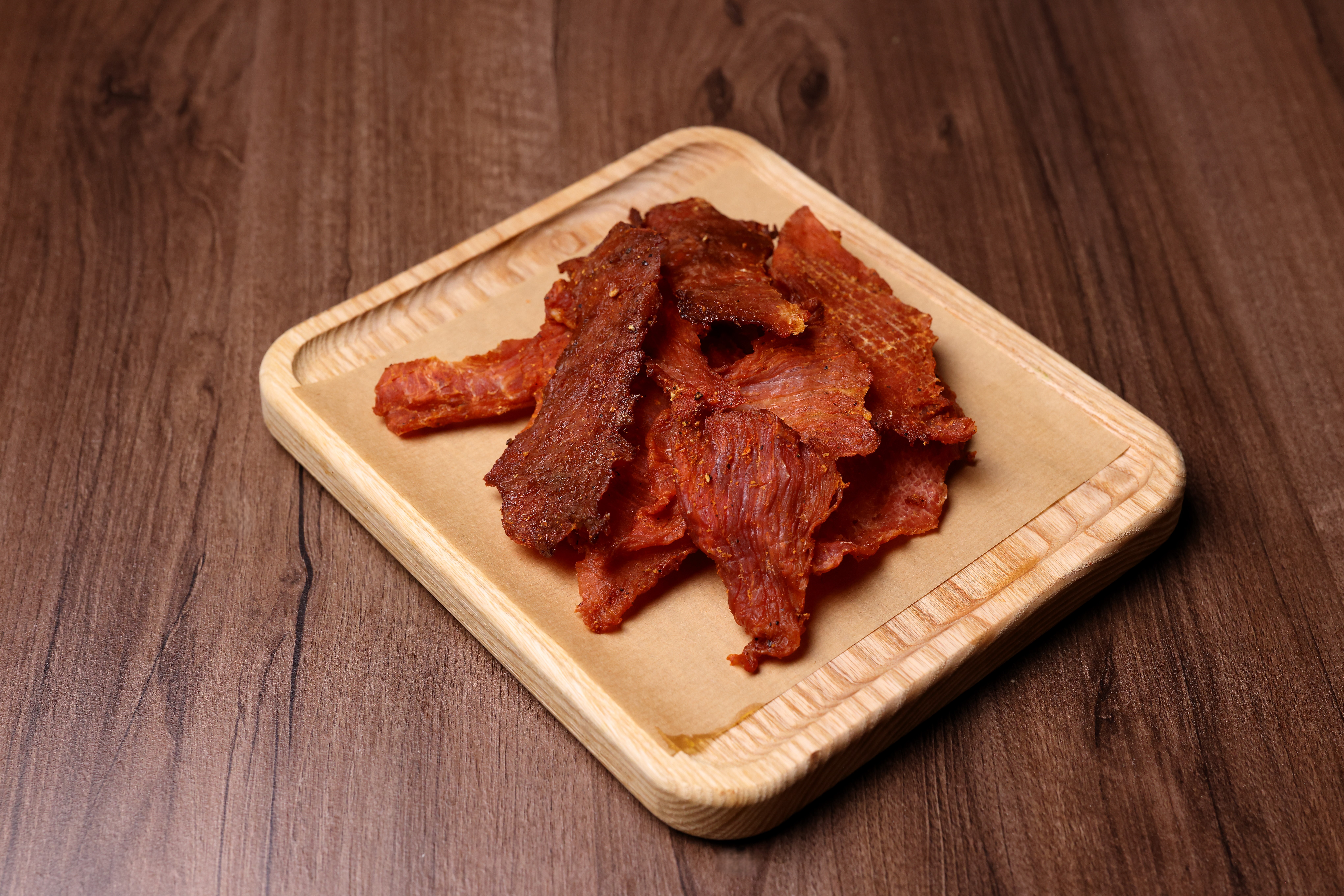 Beef gravlax, homemade sausages, chicken jerky, beef jerky, pork jerky, potato chips, caramelized almonds, pistachios, tzatziki, sweet chili sauce.