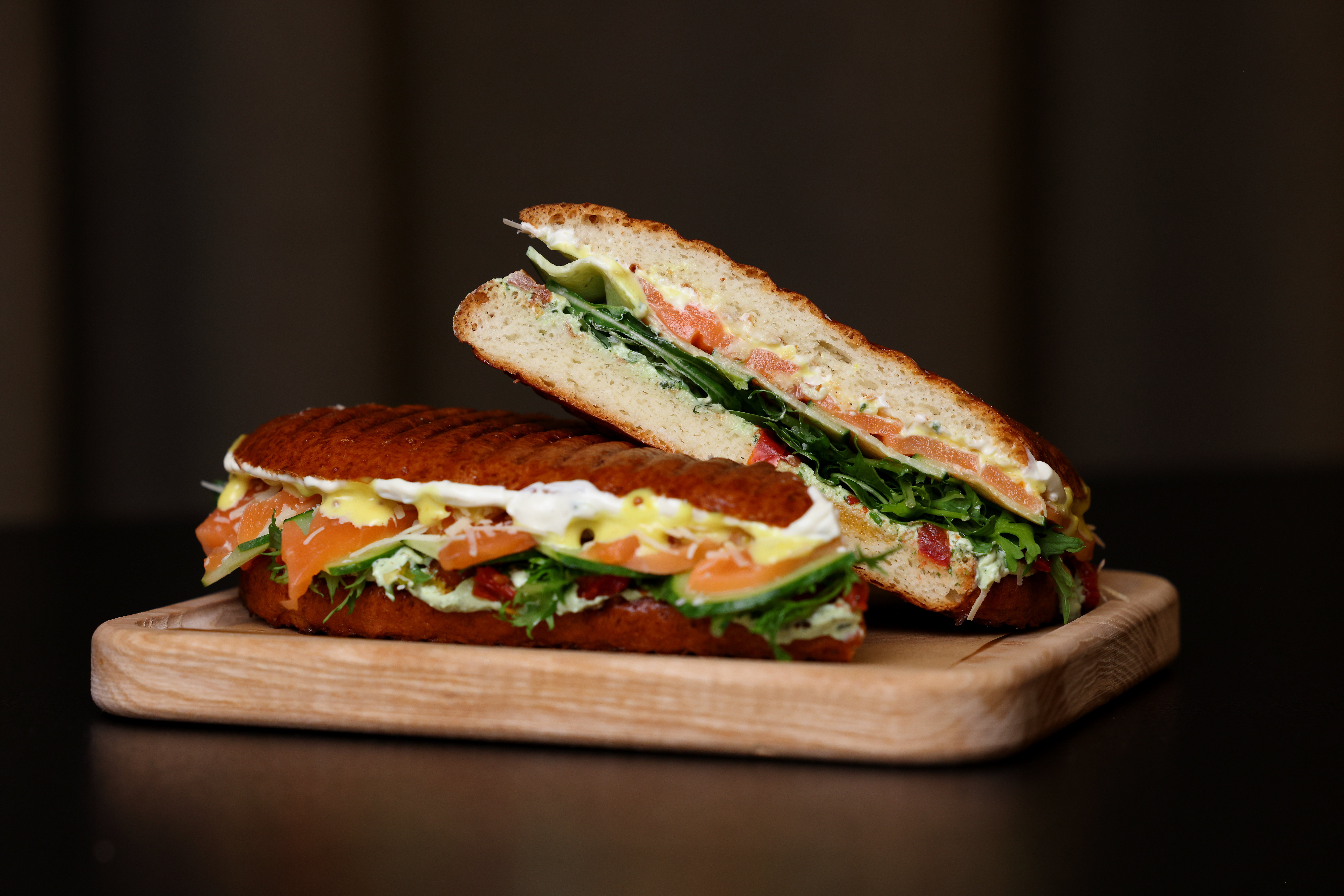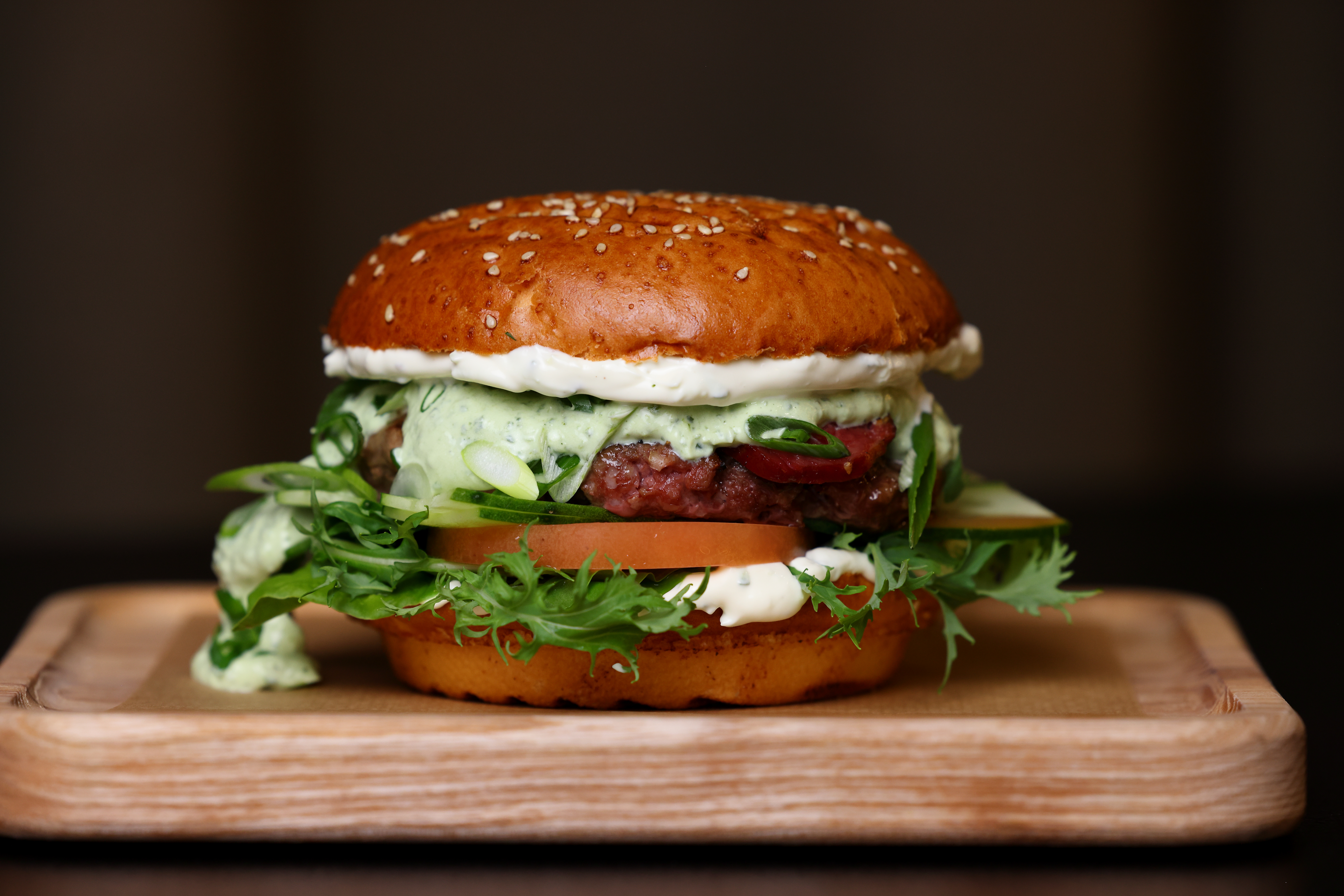 Бриошь, котлета из говядины, соус цацики, крем из йогурта и базилика, микс салата, помидоры, огурцы, сыр камамбер, брискет, зеленый лук, соус дзадзики.