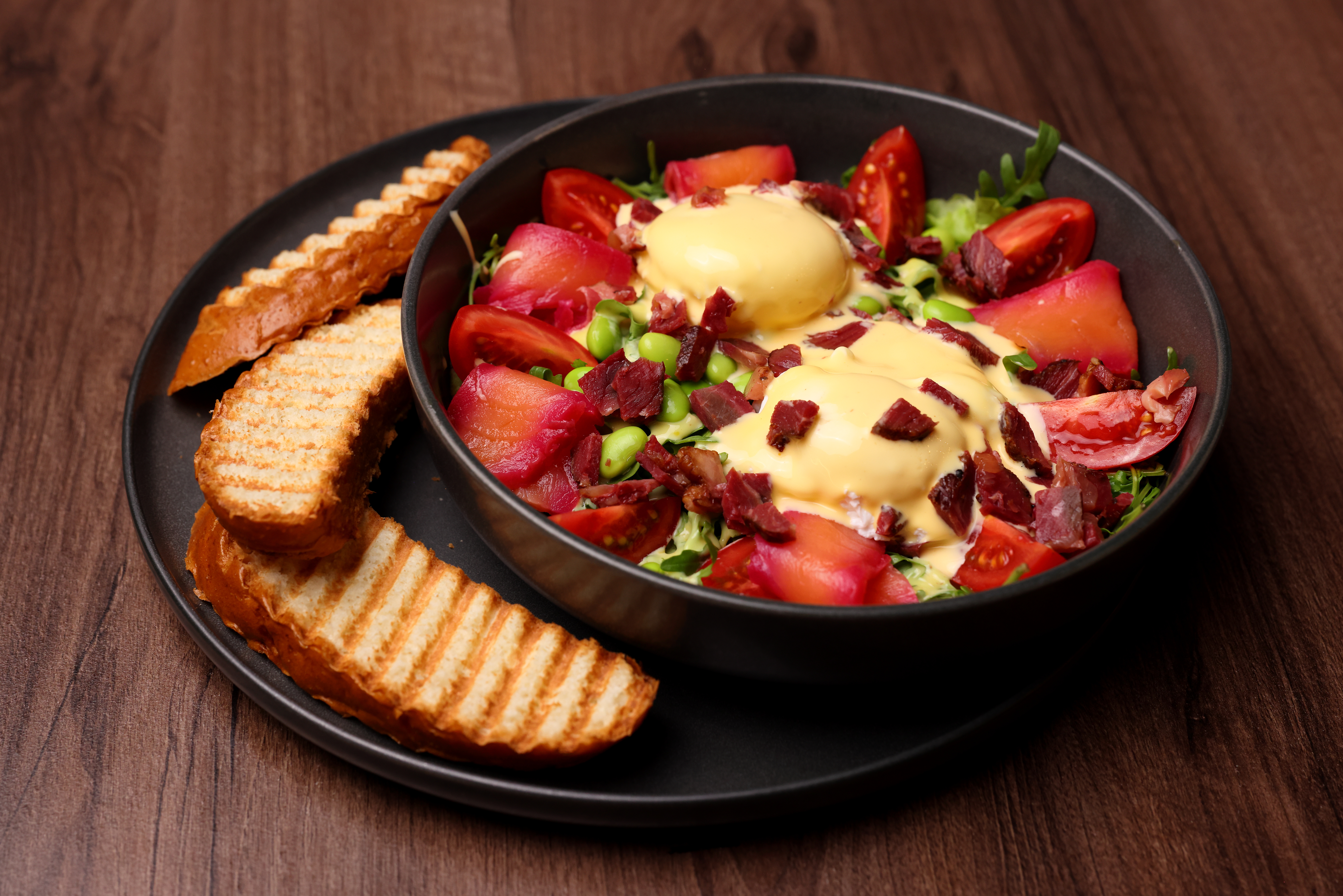 Poached eggs, lightly salted salmon, brisket, cheese sauce, edamame, mixed salad, cherry tomatoes, truffle-flavored honey mustard dressing.