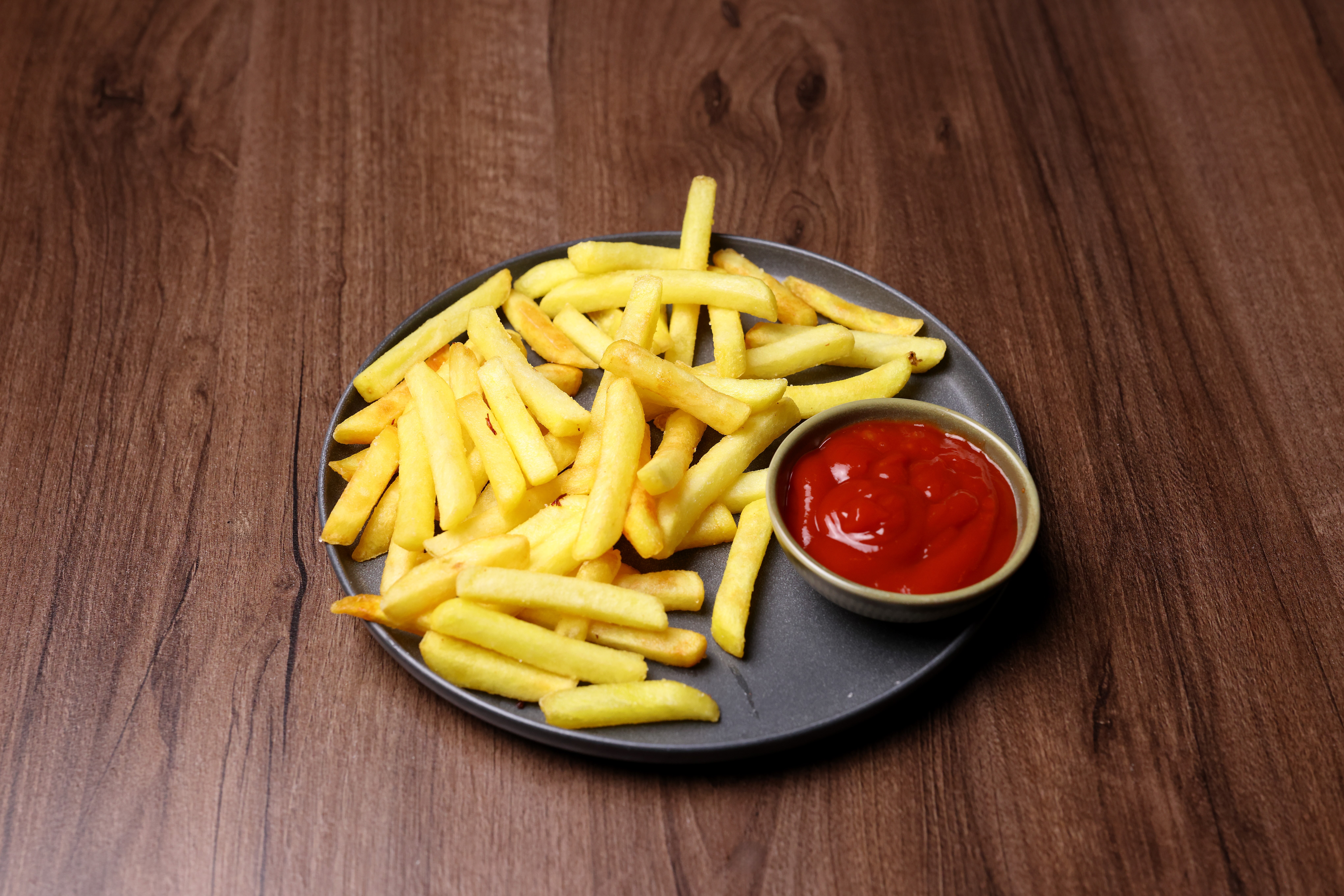 Глазированные свиные ребра, салат, картофель фри, соус сладкий чили, соус дзадзики, зеленый лук, кунжут.