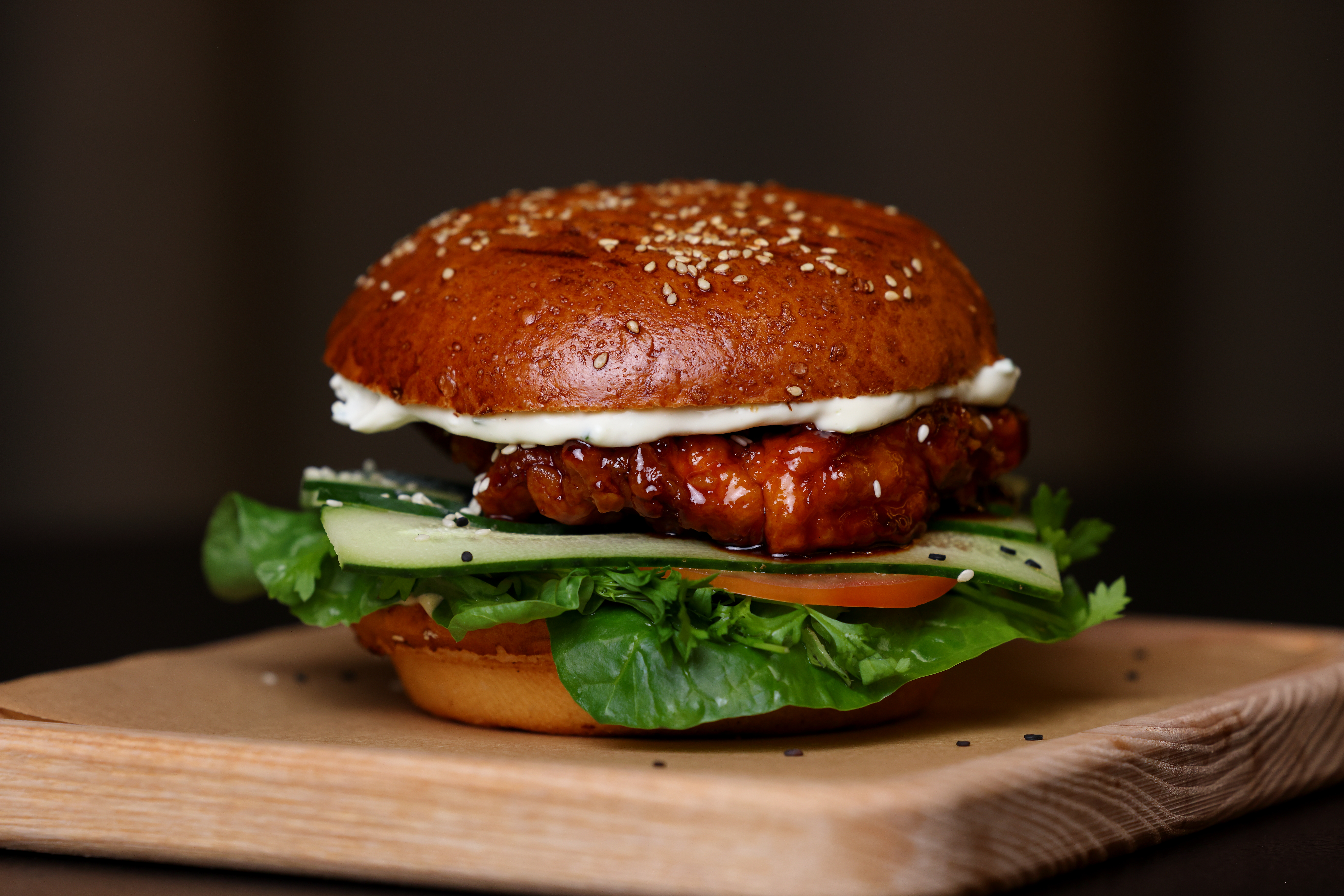 Булочка Banh Mi, куриное бедро, пастрами из курицы, сырный соус, соус дзадзики, маринованные огурцы, помидоры, микс салата.