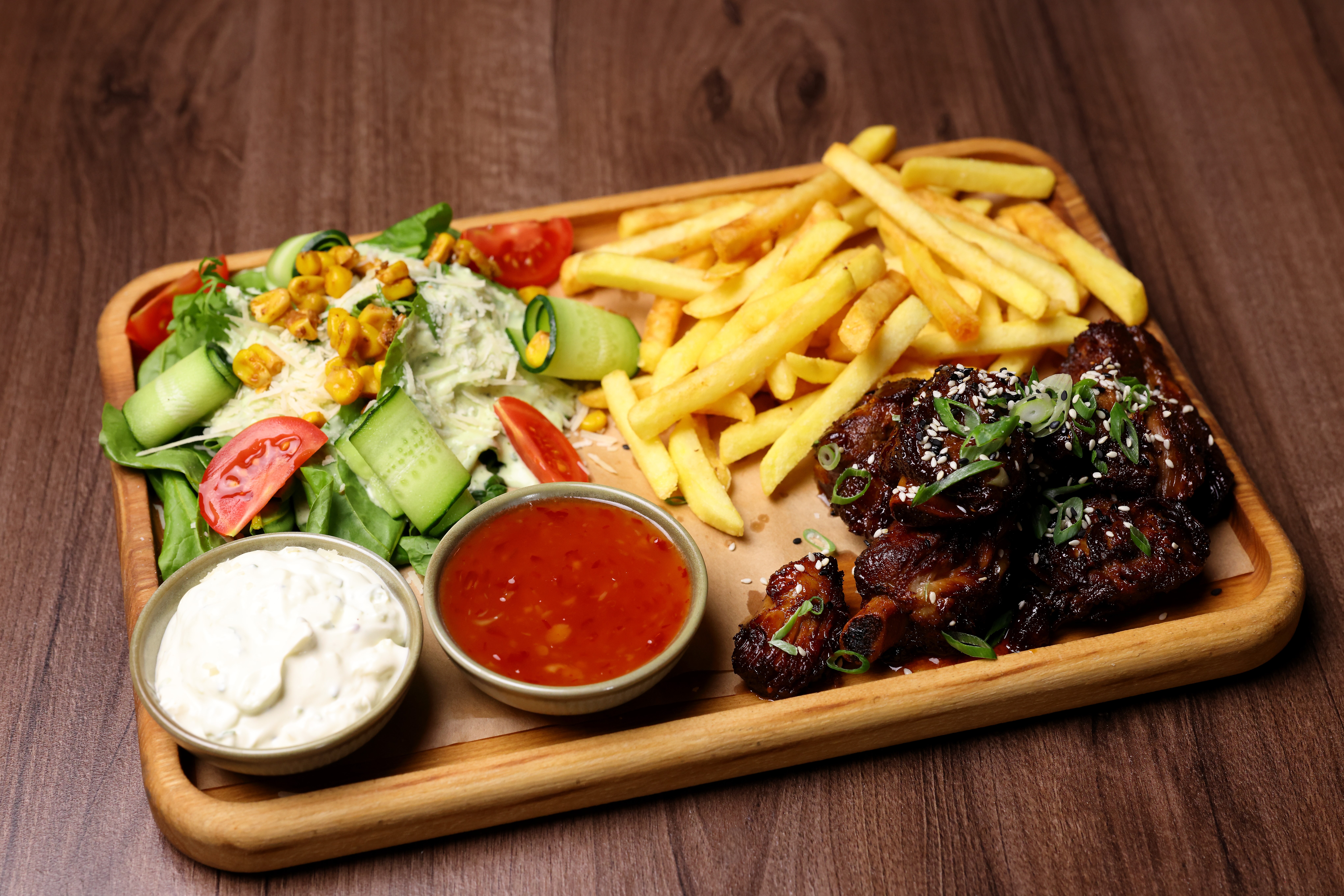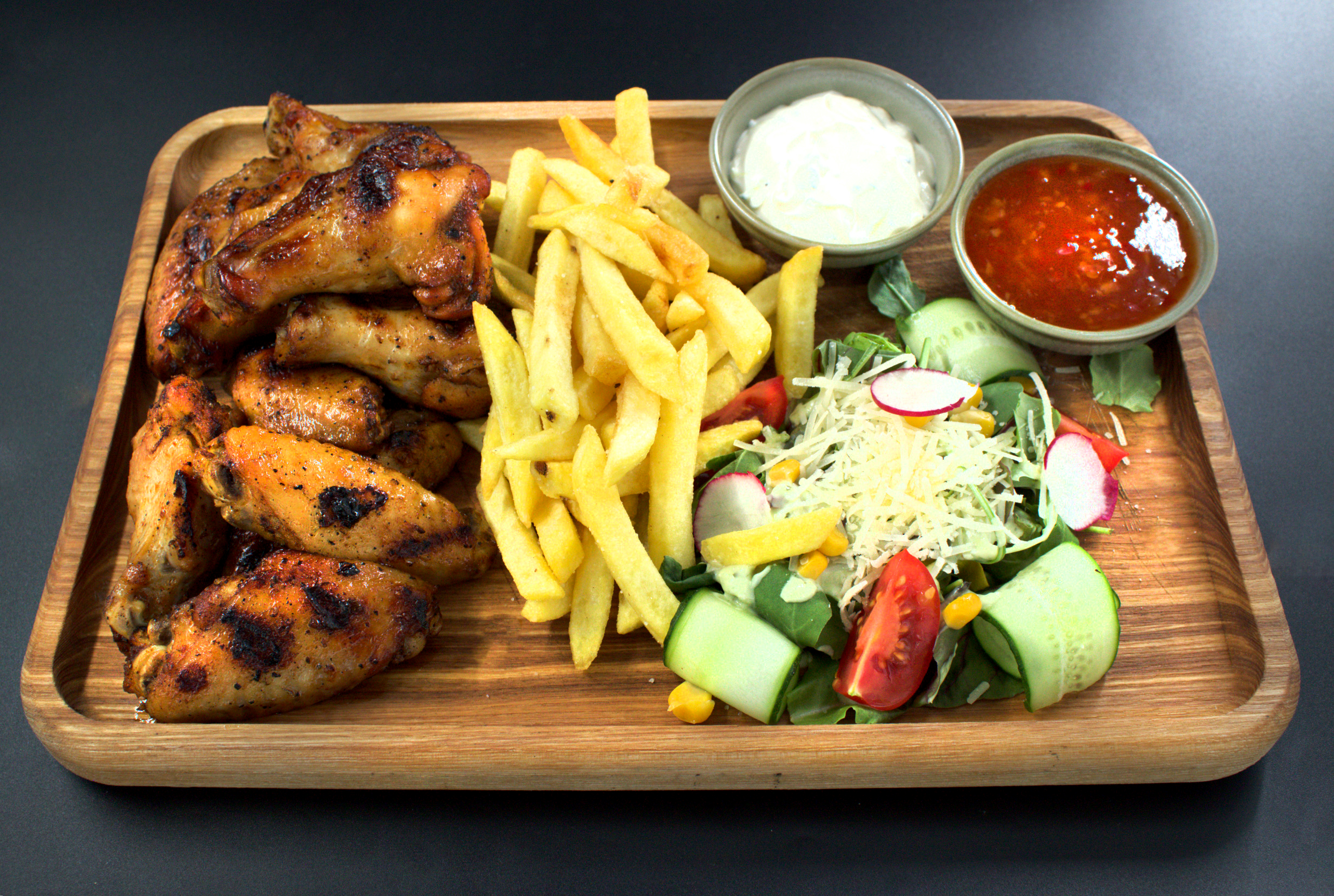 Aripi de pui, cartofi pai, salata casei, sos sweet-chili, sos tzatziki.