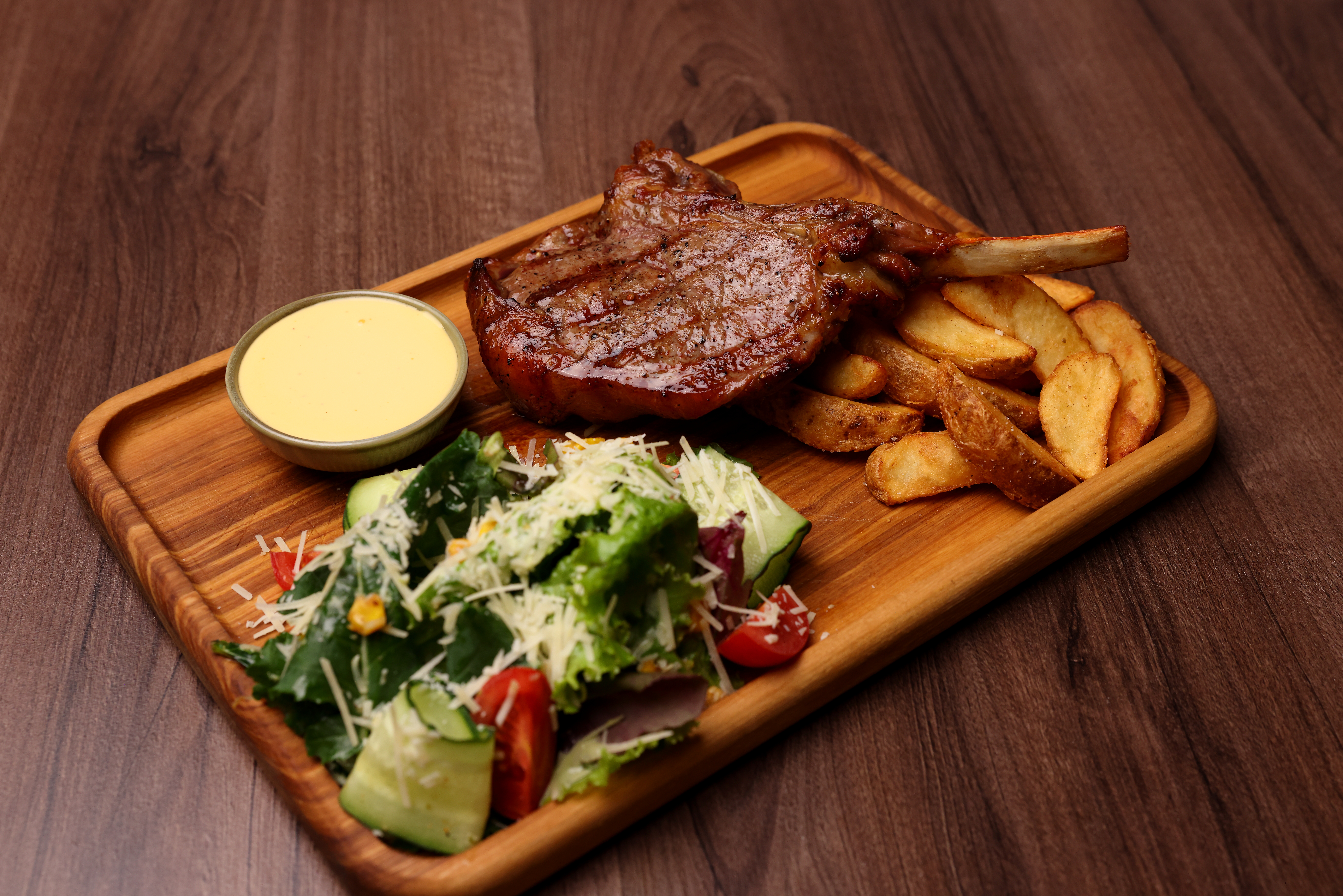 Costițe de porc glazurate, salata casei, cartofi pai, sos sweet-chili, sos tzatziki, ceapă verde, susan.