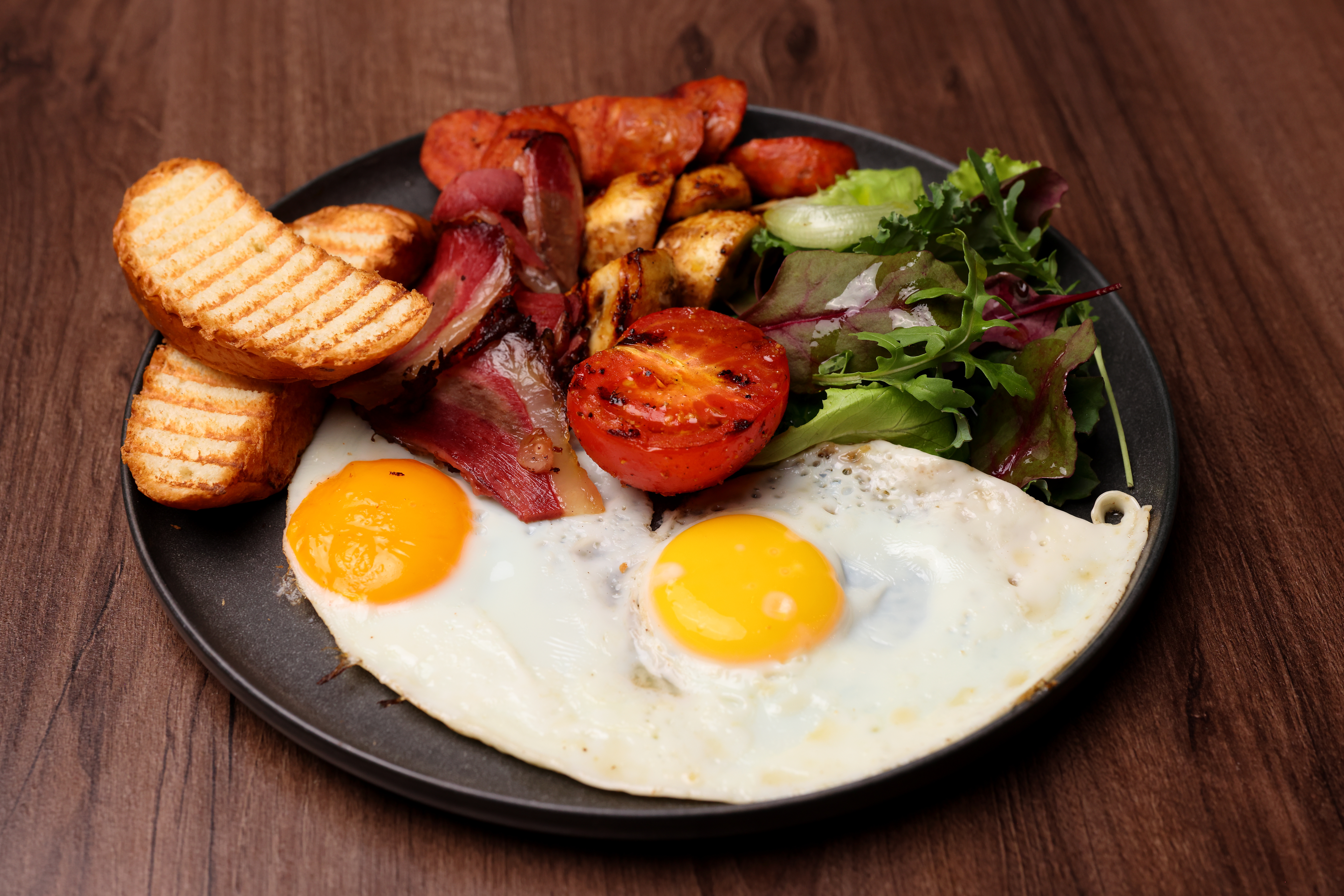 Ouă, brisket, cârnăciori de casă, roșii, ciuperci, salată mix, pâine grillată.