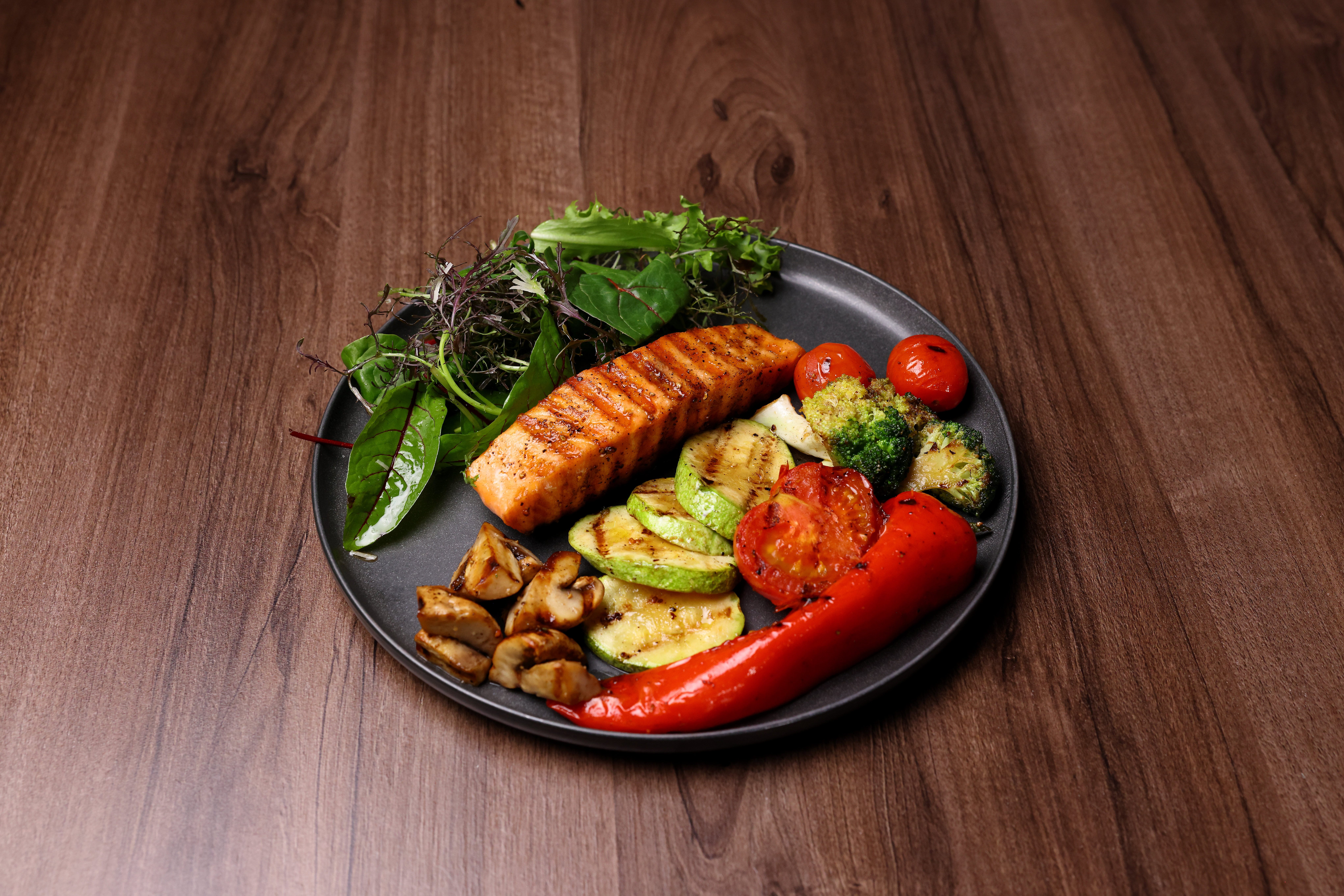 Steak de ton, mix de salată, sos de portocală, rodie, cașcaval Grana Padano, roșii cherry, măsline verzi, portocală, fistic, fulgi de ton.