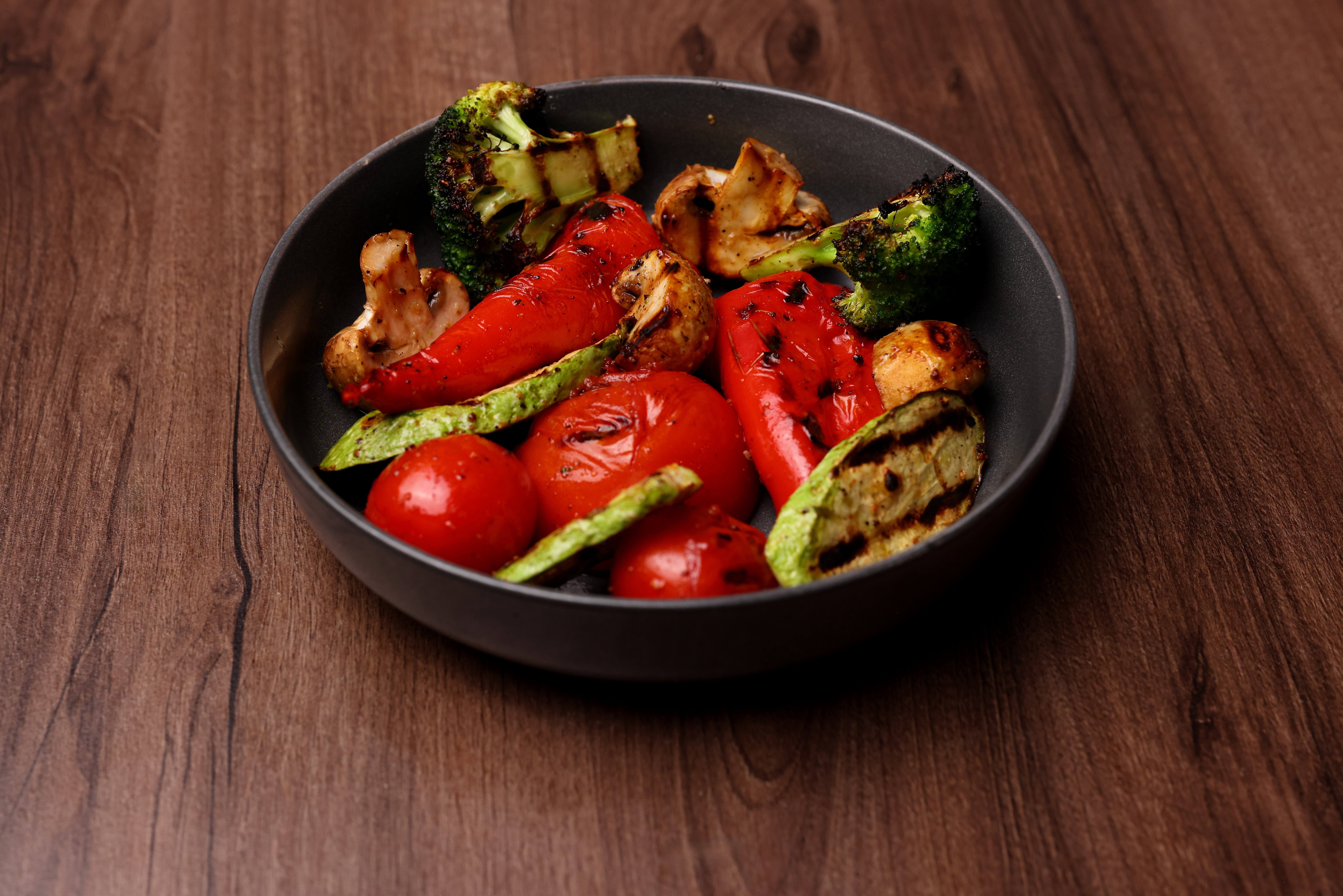 Steak de vită, salată mix, roșii cherry, castravete, dressing de muștar și miere cu aromă de trufe, măsline verzi, portocală, ardei copt, cașcaval Grana Padano.