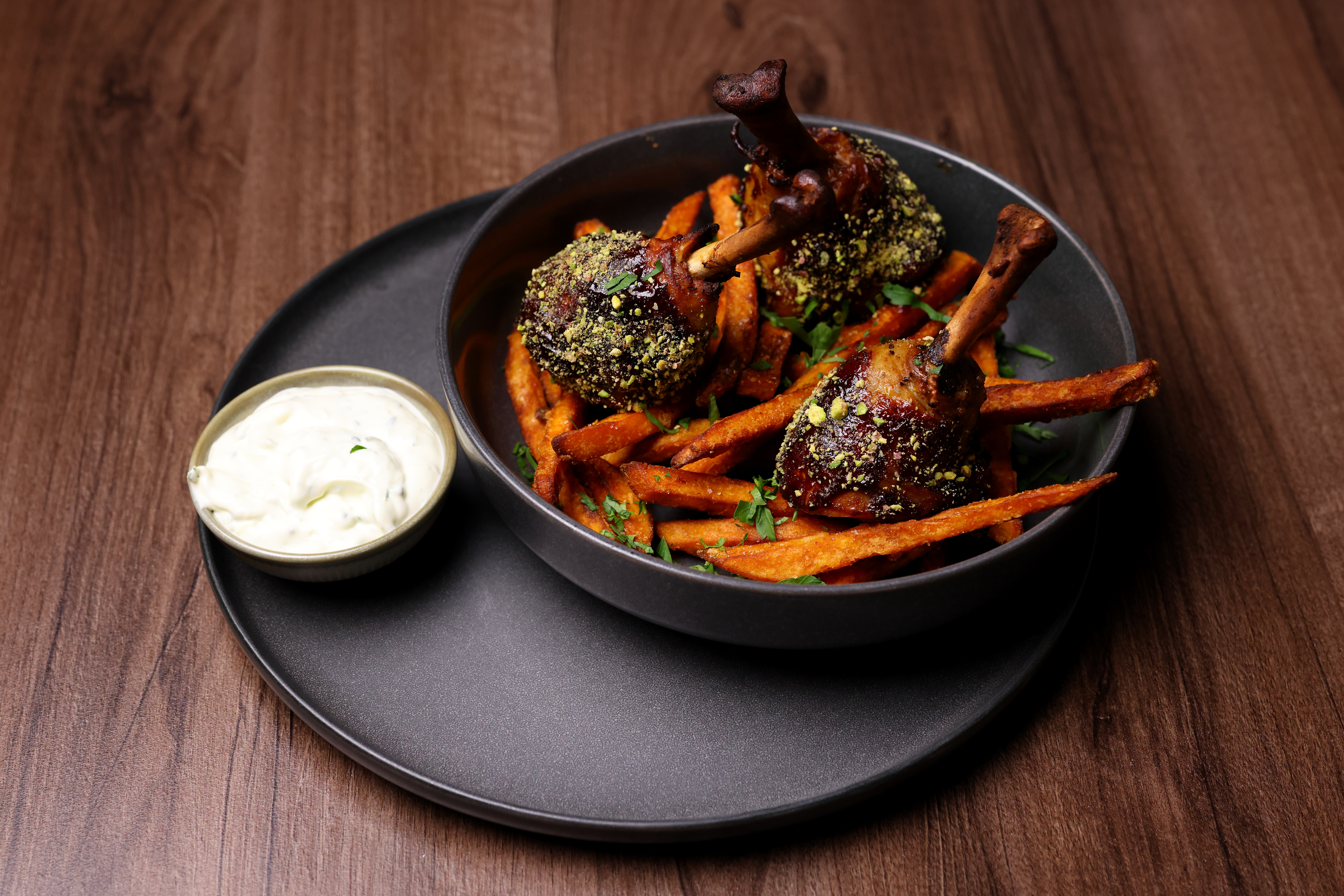 Chicken drumsticks glazed in BBQ sauce with pistachio crust, sweet potato, parsley, tzatziki sauce.
