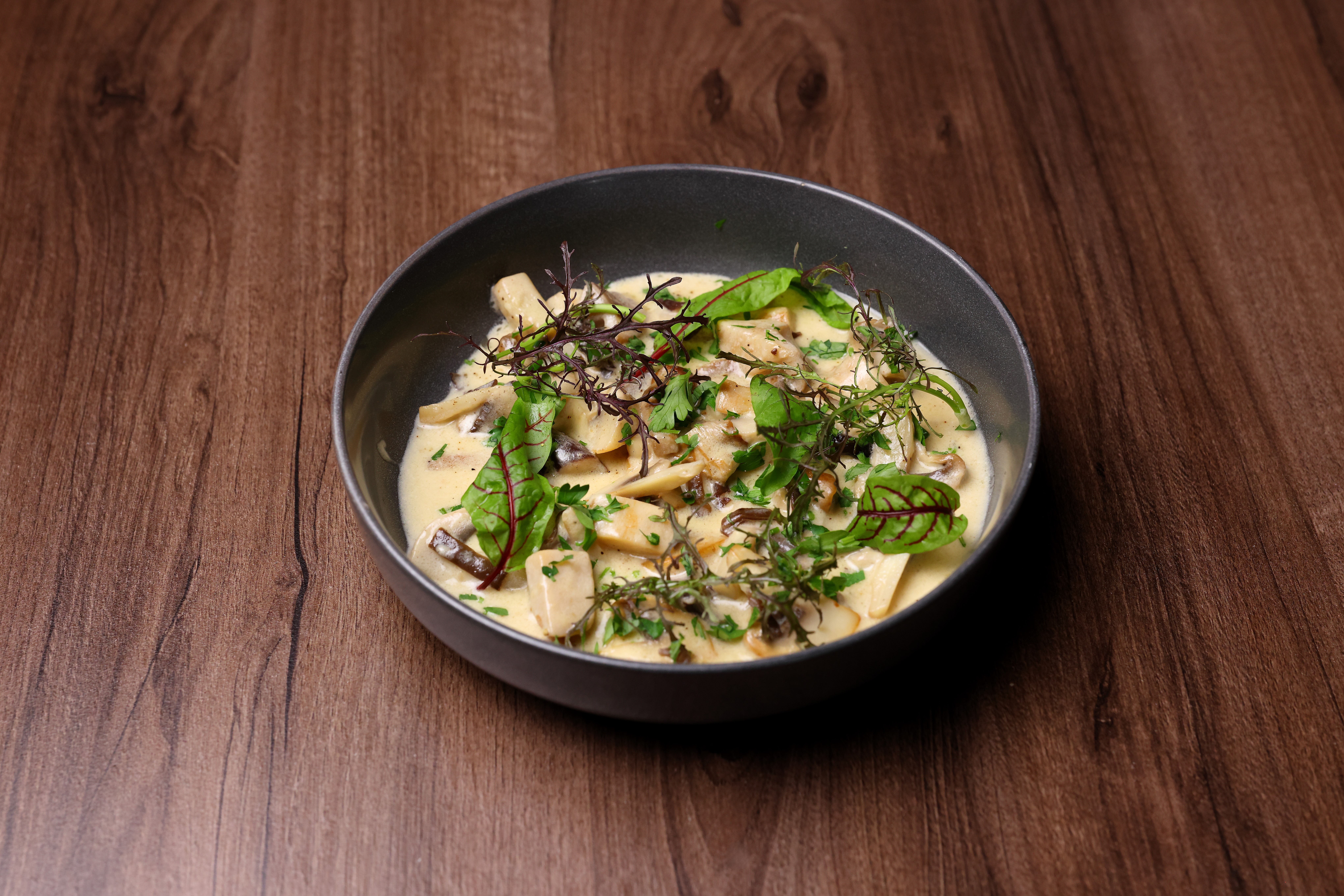 Chicken broth, rice noodles, corn, vegetable mix, chicken lollipop, chicken pastrami, cream, Grana Padano cheese, truffle oil, parsley, croutons.