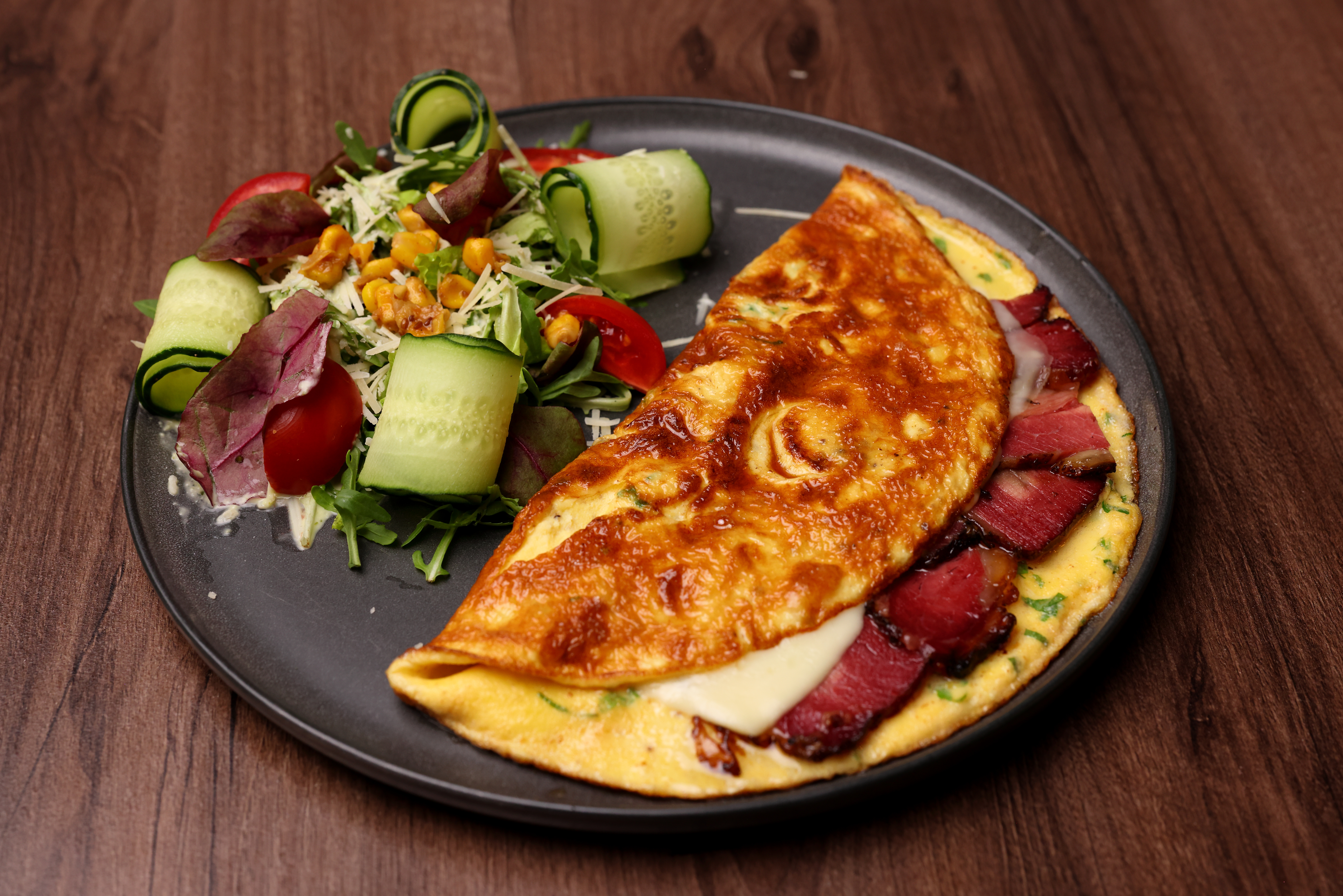Ouă, brisket, frișcă, cașcaval edam, salata casei.