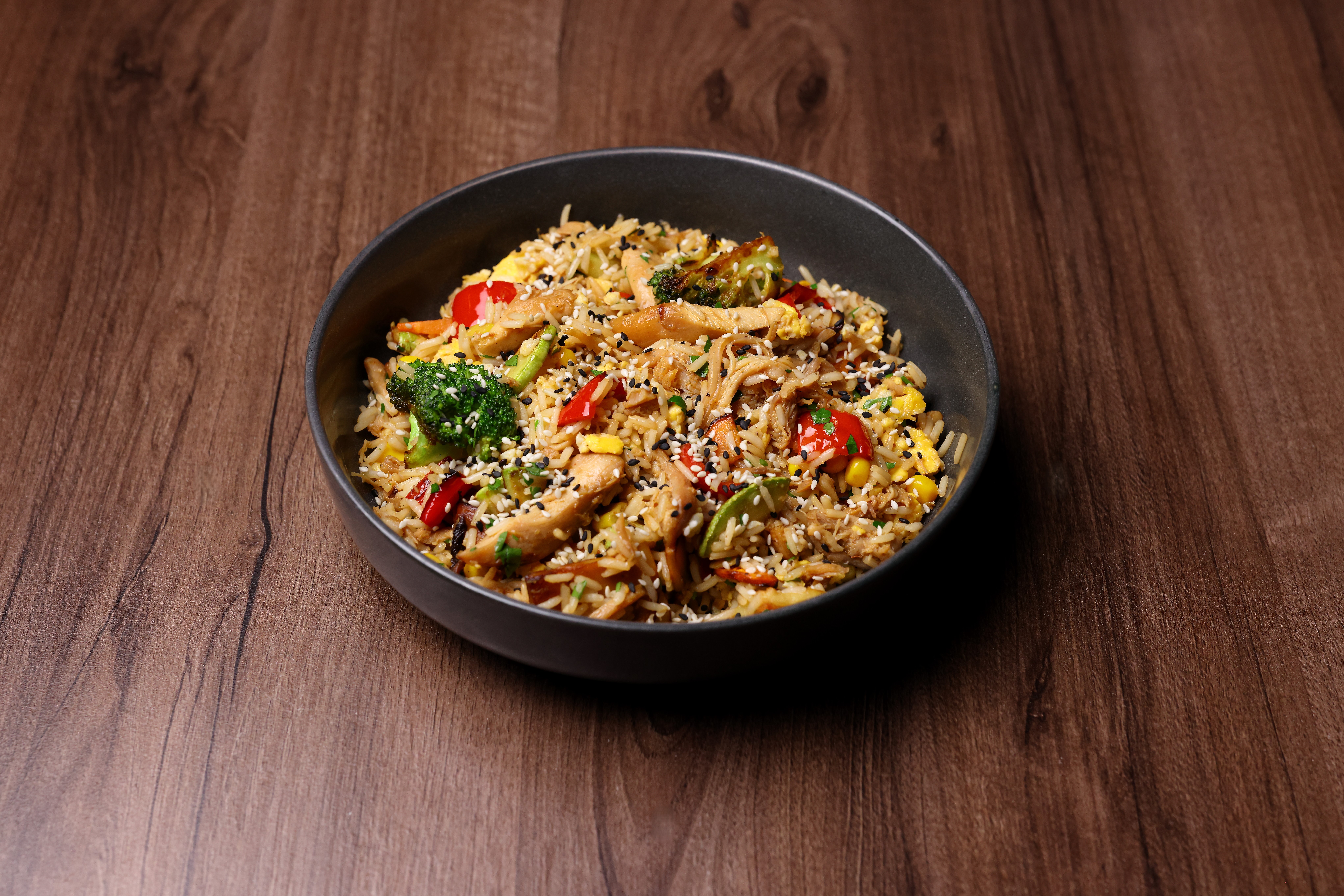 Рис, куриное мясо, микс овощей, кукуруза, яйцо, соевый соус, кунжут, кунжутное масло, петрушка.