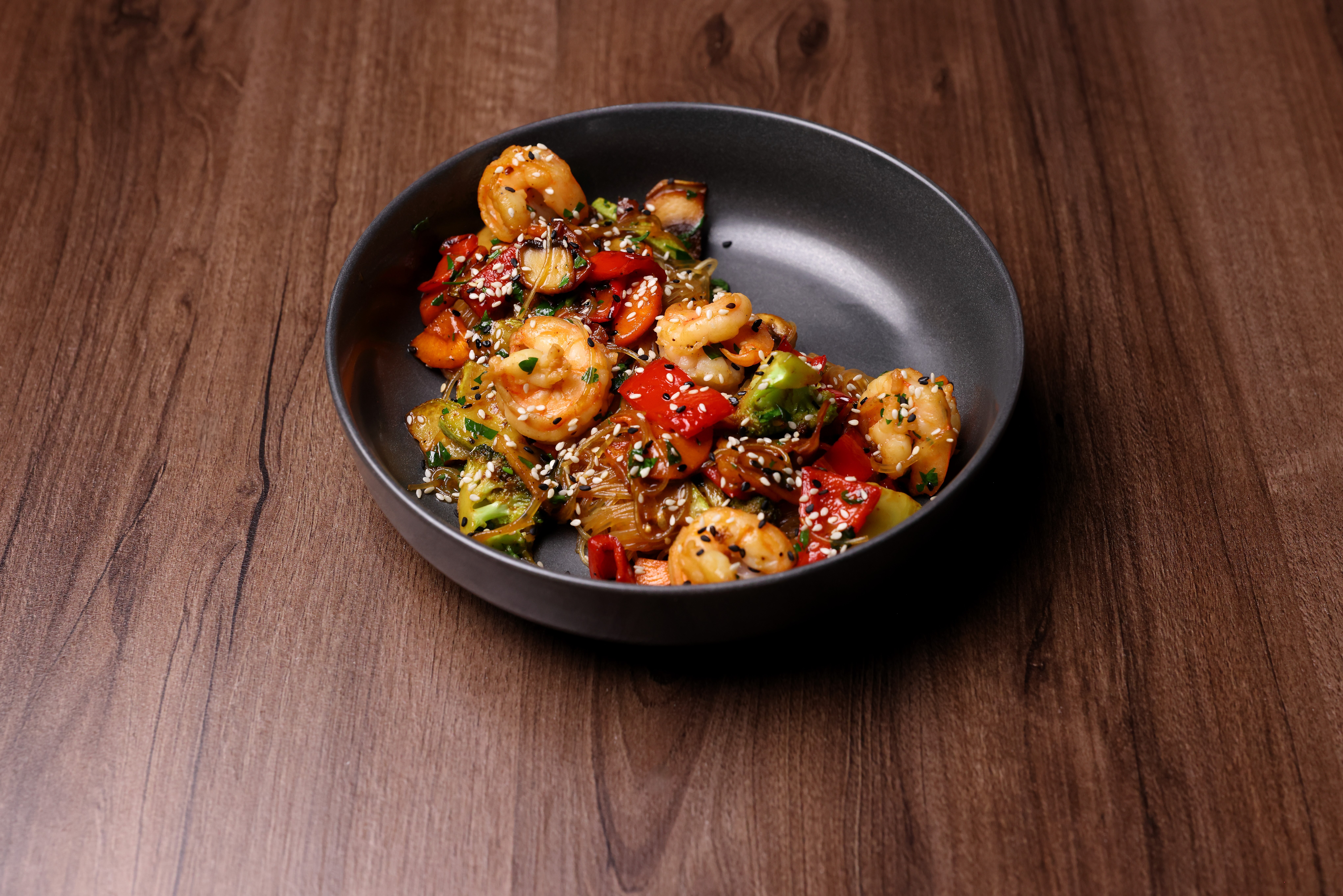 Fidea de soia, creveți, mix de legume, sos thai, susan, pătrunjel.