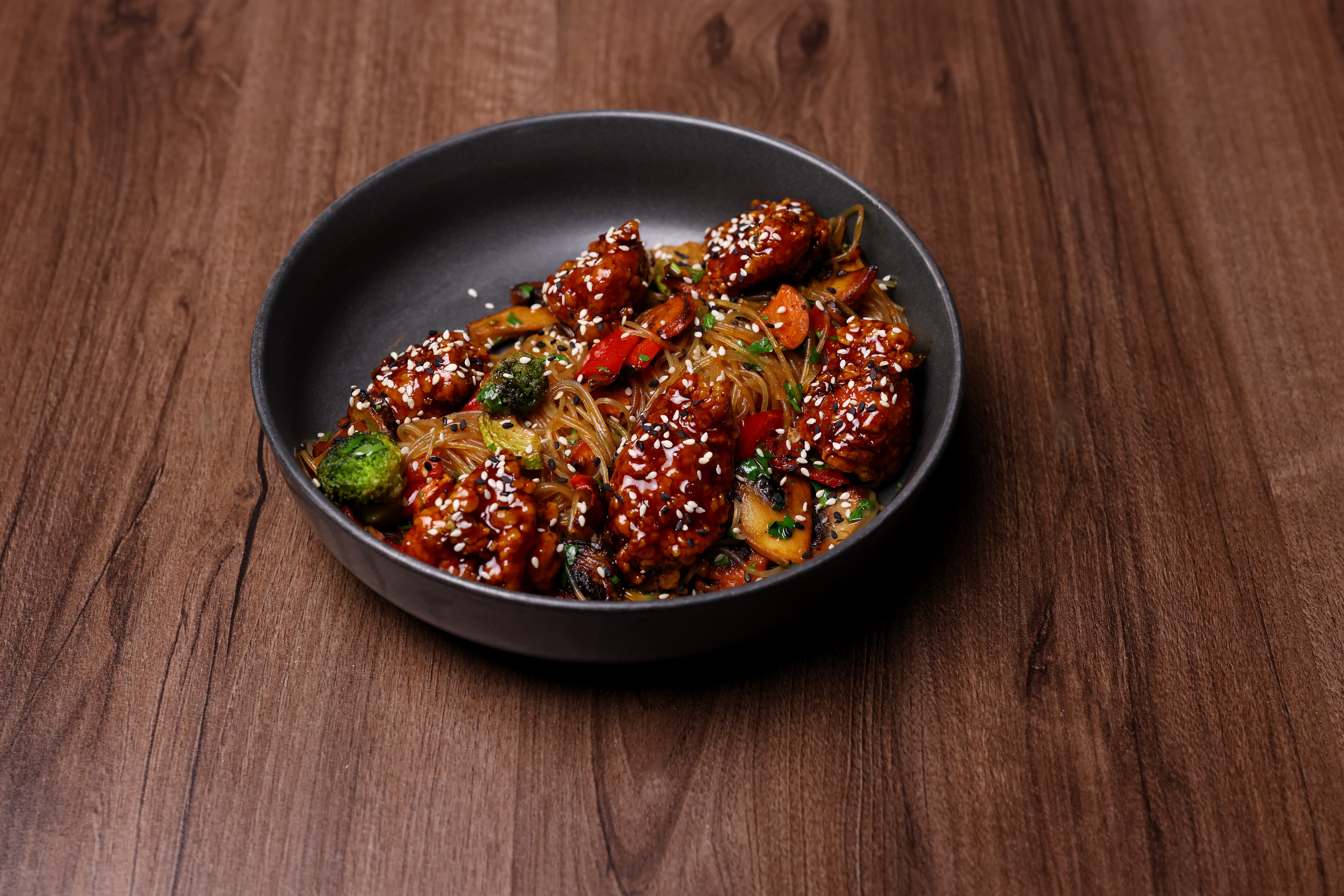 Соевая лапша, панированное и глазированное куриное филе, микс овощей, тайский соус, кунжут, петрушка.