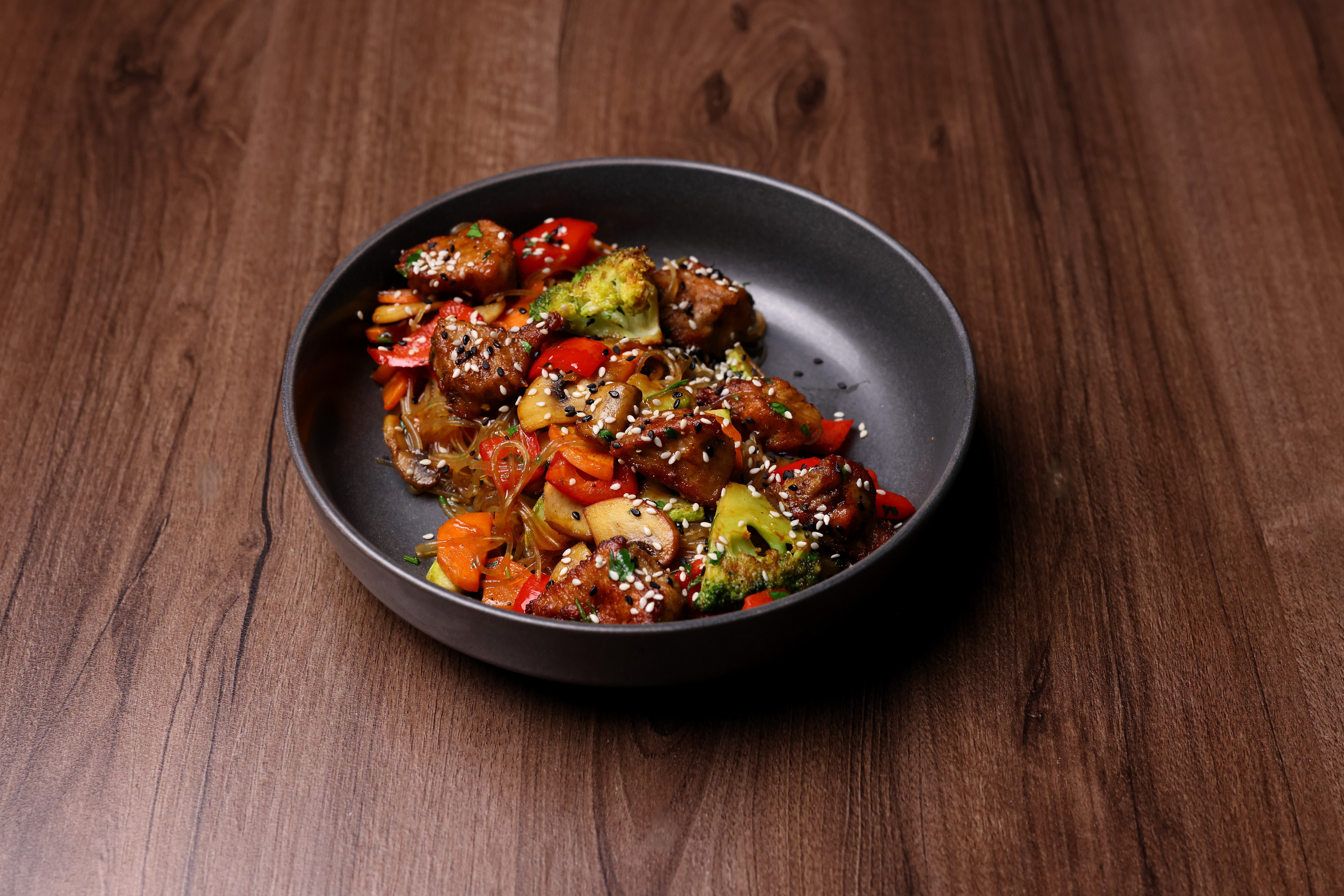 Fidea de soia, carne de vită, mix de legume, sos thai, susan, pătrunjel.