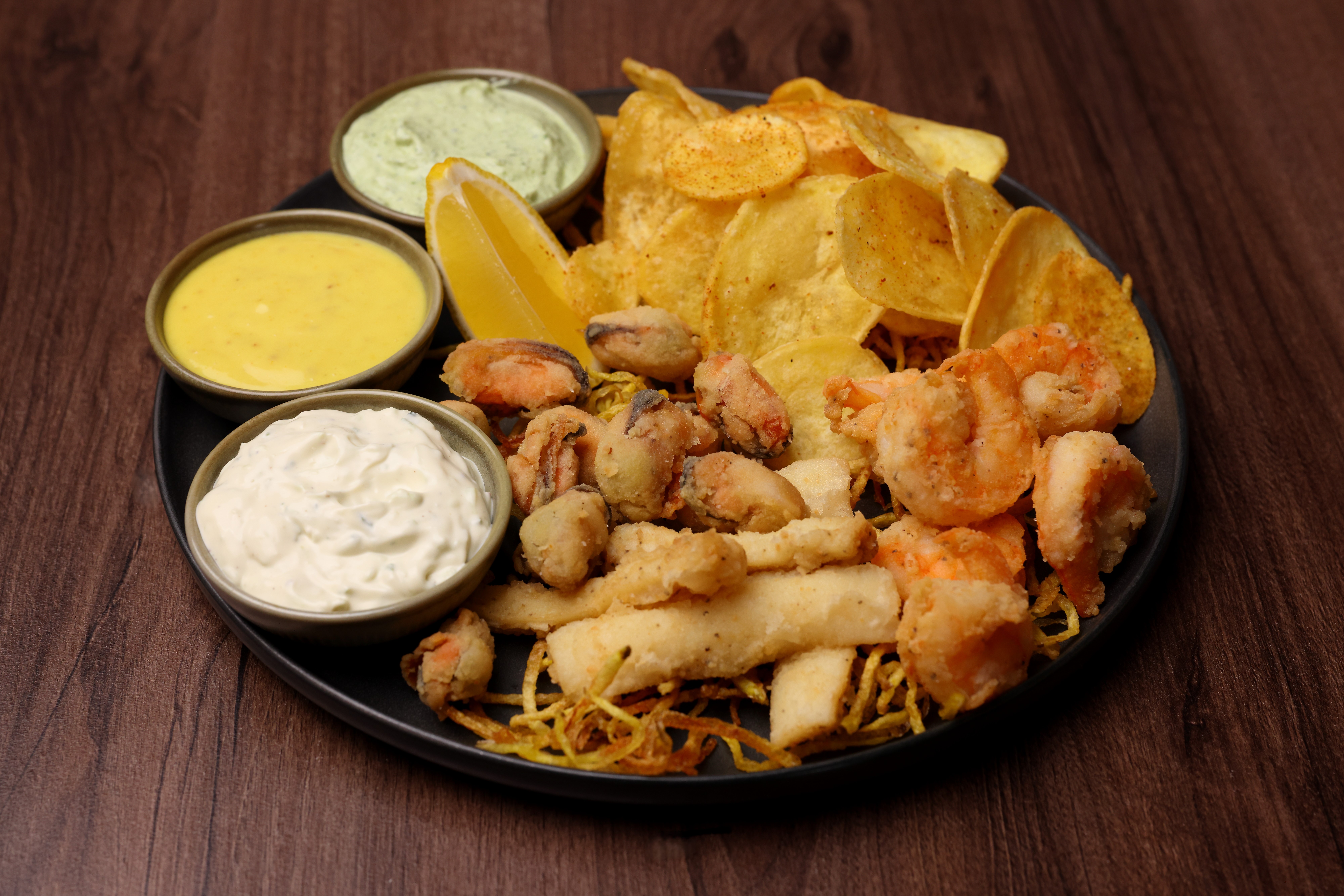 Креветки, кальмары, мидии в панировке, картофельные чипсы, лимон, соус дзадзики, крем из йогурта и базилика, соус из горчицы и меда с ароматом трюфелей.