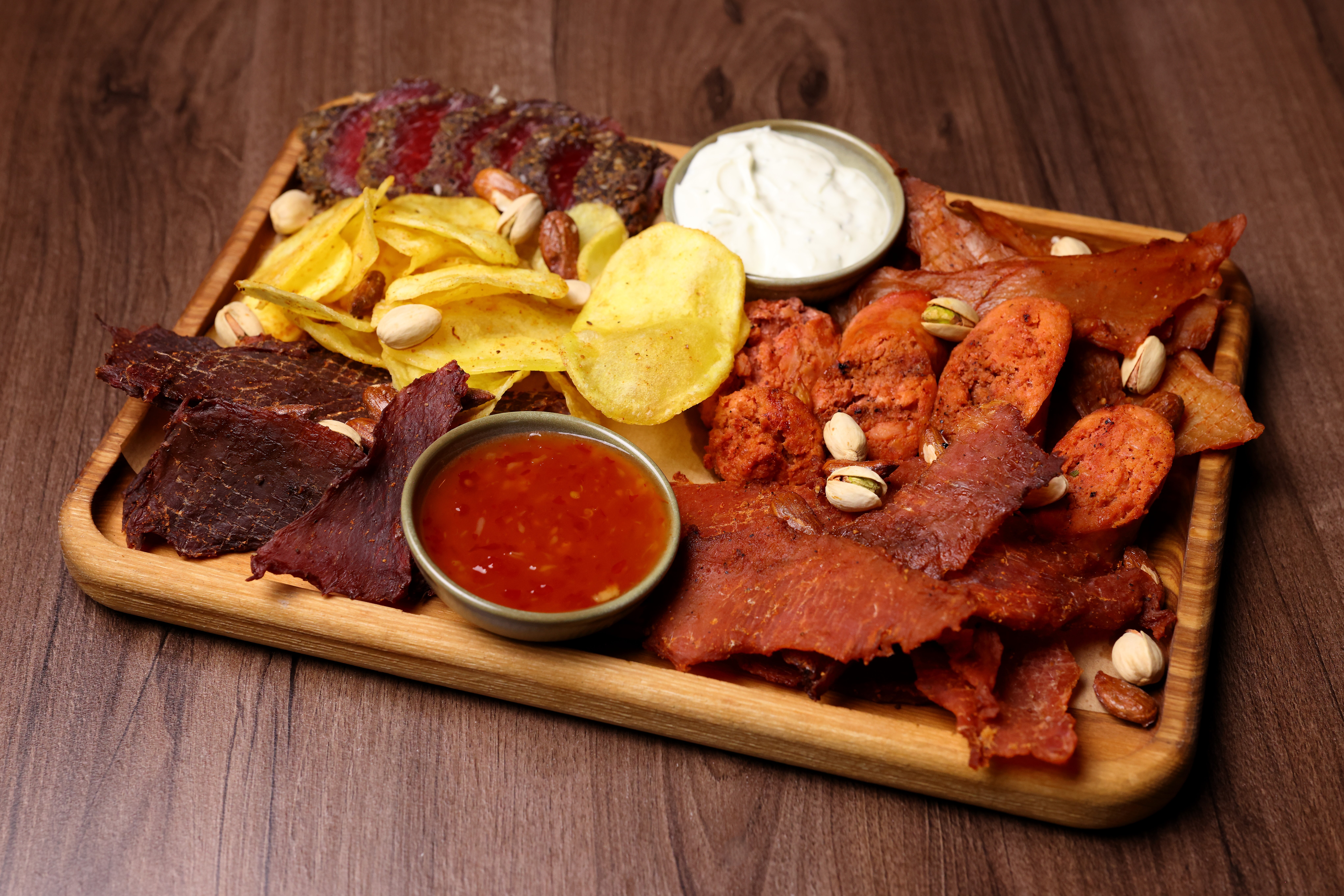 Гравлакс из говядины, домашние колбаски, куриные джерки, говяжьи джерки, джерки из свинины, картофельные чипсы, карамелизированный миндаль, фисташки, соус дзадзики, соус сладкий чили.