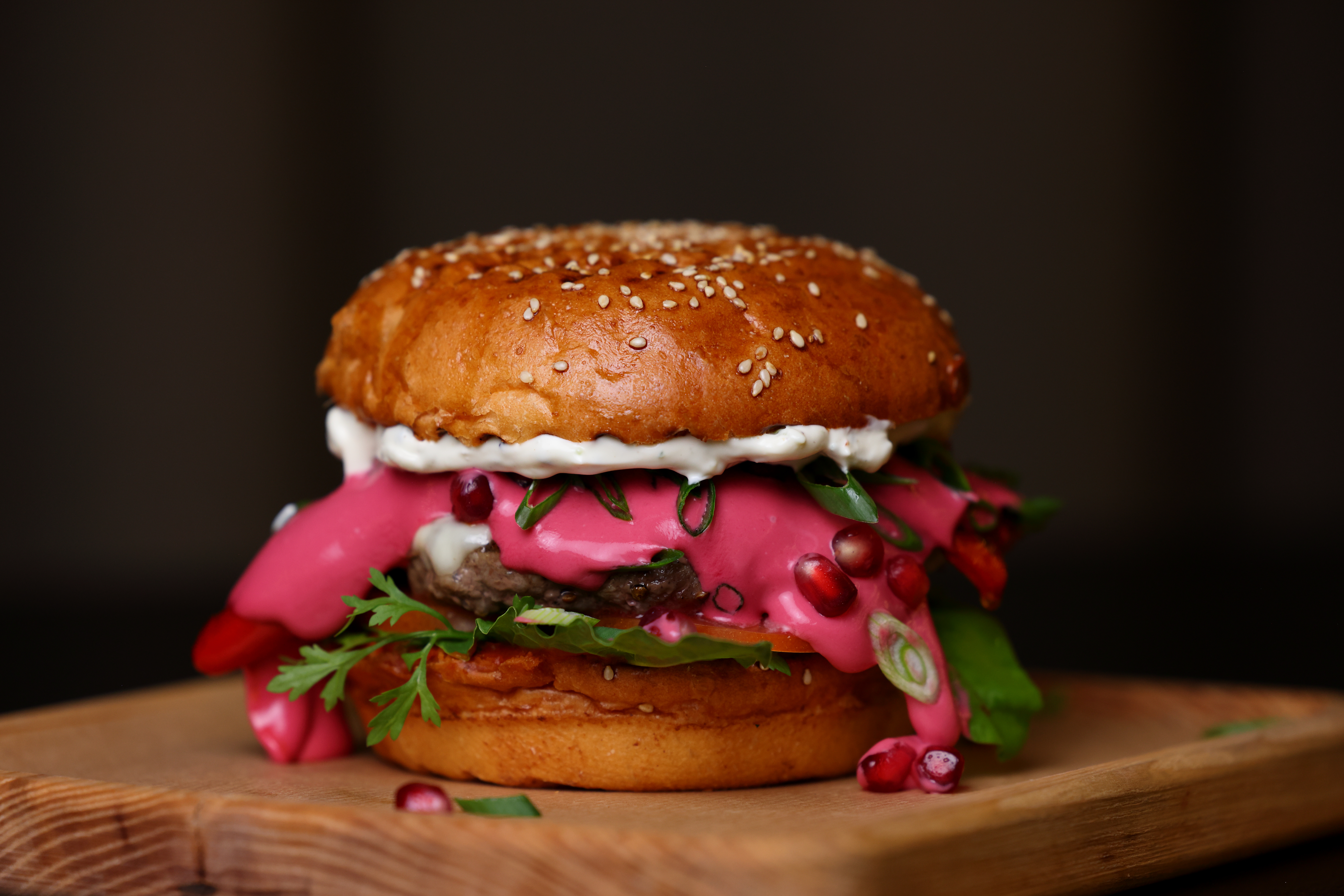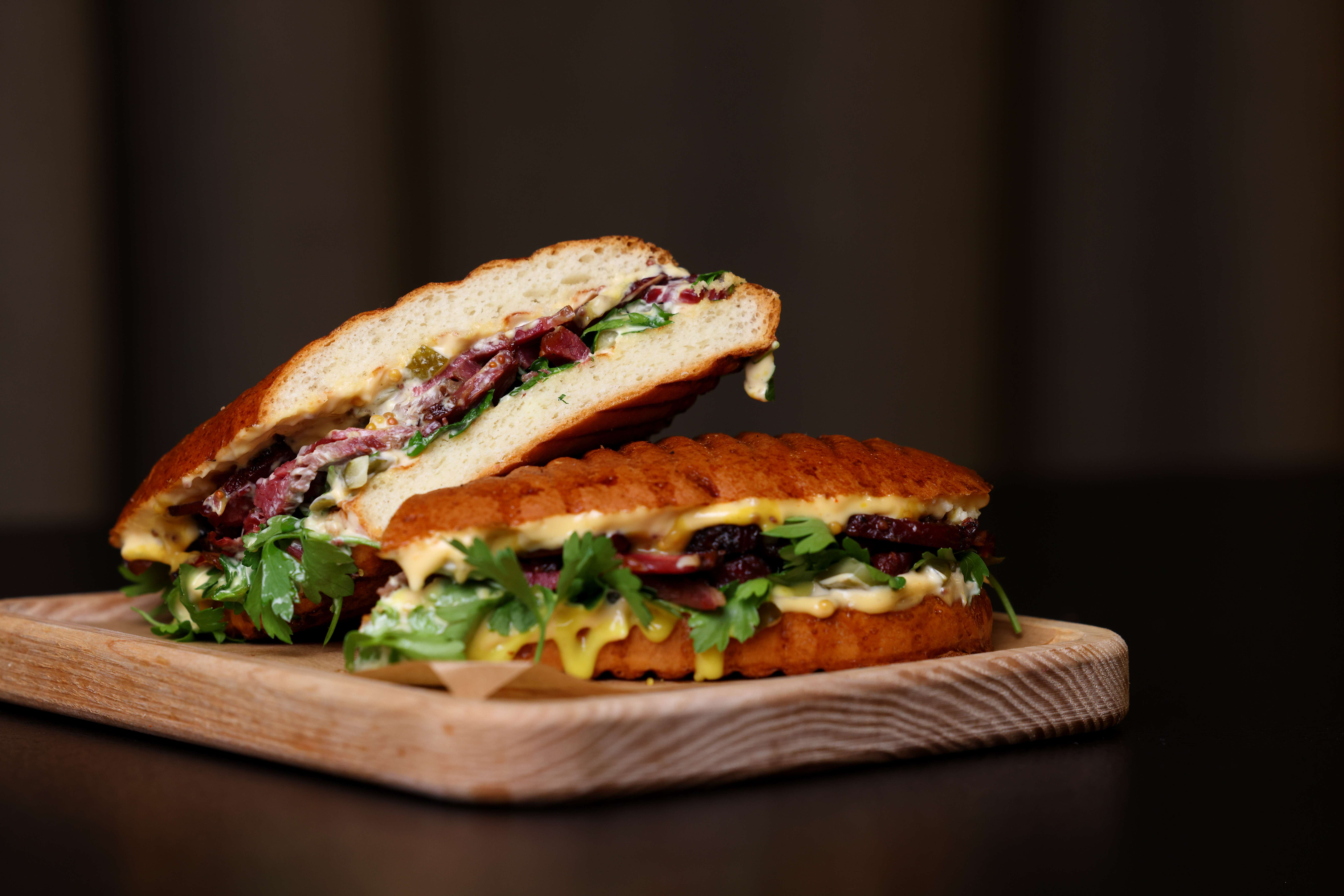 Brioșă, pârjoală de vită, brisket, sos burger, dressing de muștar, pătrunjel, castravete marinat.