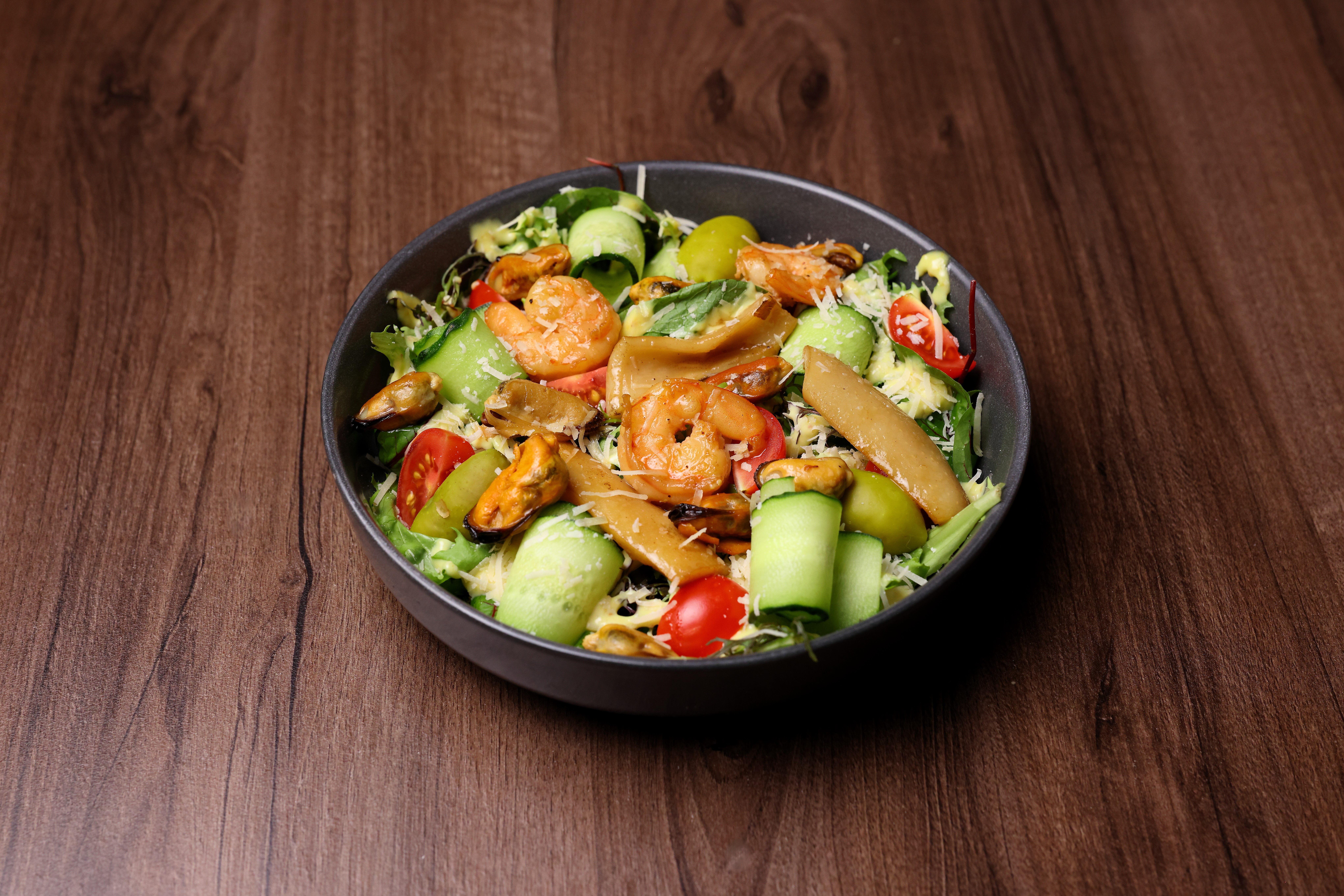 Creveți, midii, calmar sotate în vin, salată mix, dressing de muștar și miere cu aromă de trufe, cașcaval Grana Padano, roșii cherry, castravete, edamame, măsline verzi.
