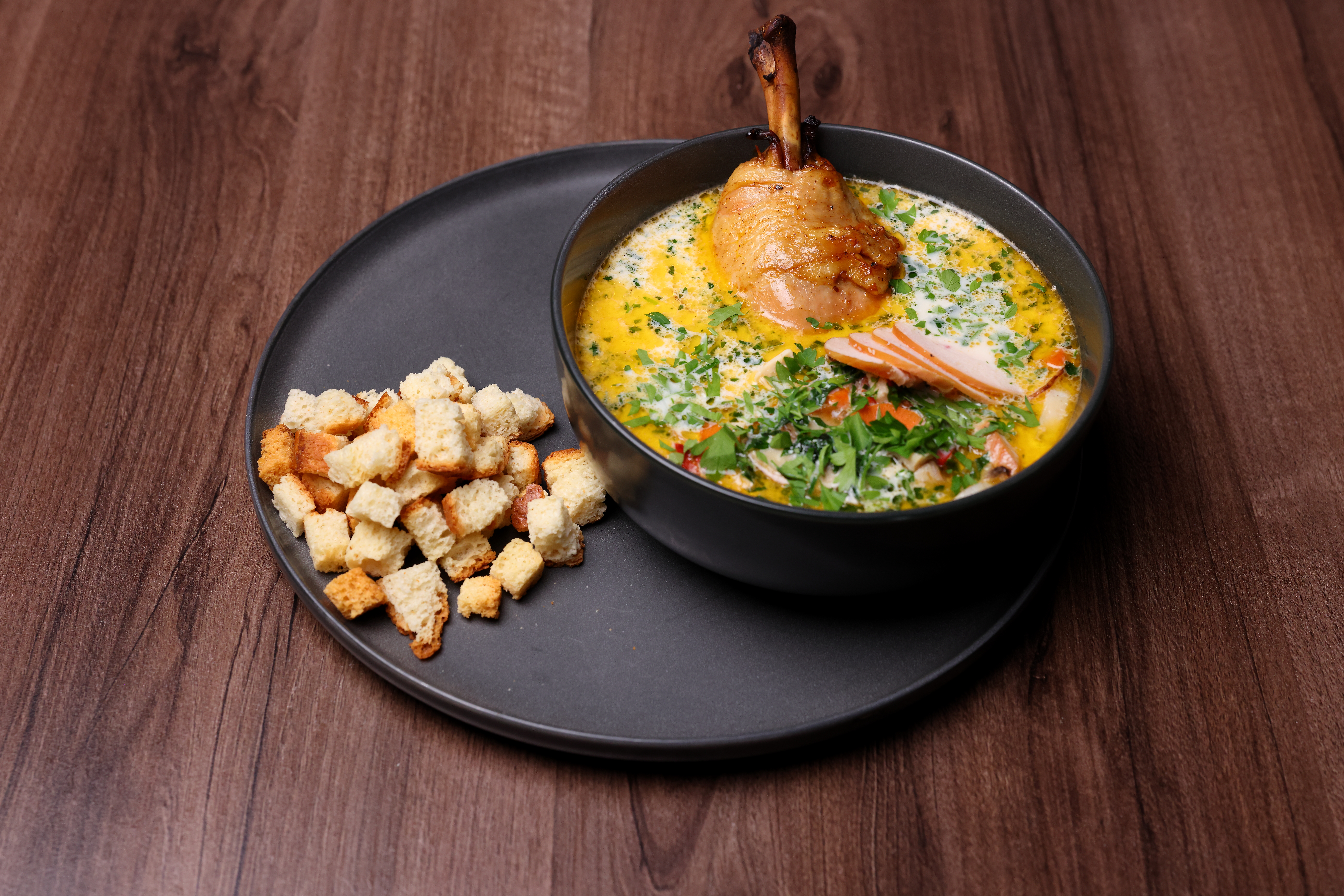 Куриный бульон, рисовая лапша, кукуруза, микс овощей, куриная голень, пастрами из курицы, сливки, сыр Grana Padano, трюфельное масло, петрушка, гренки.