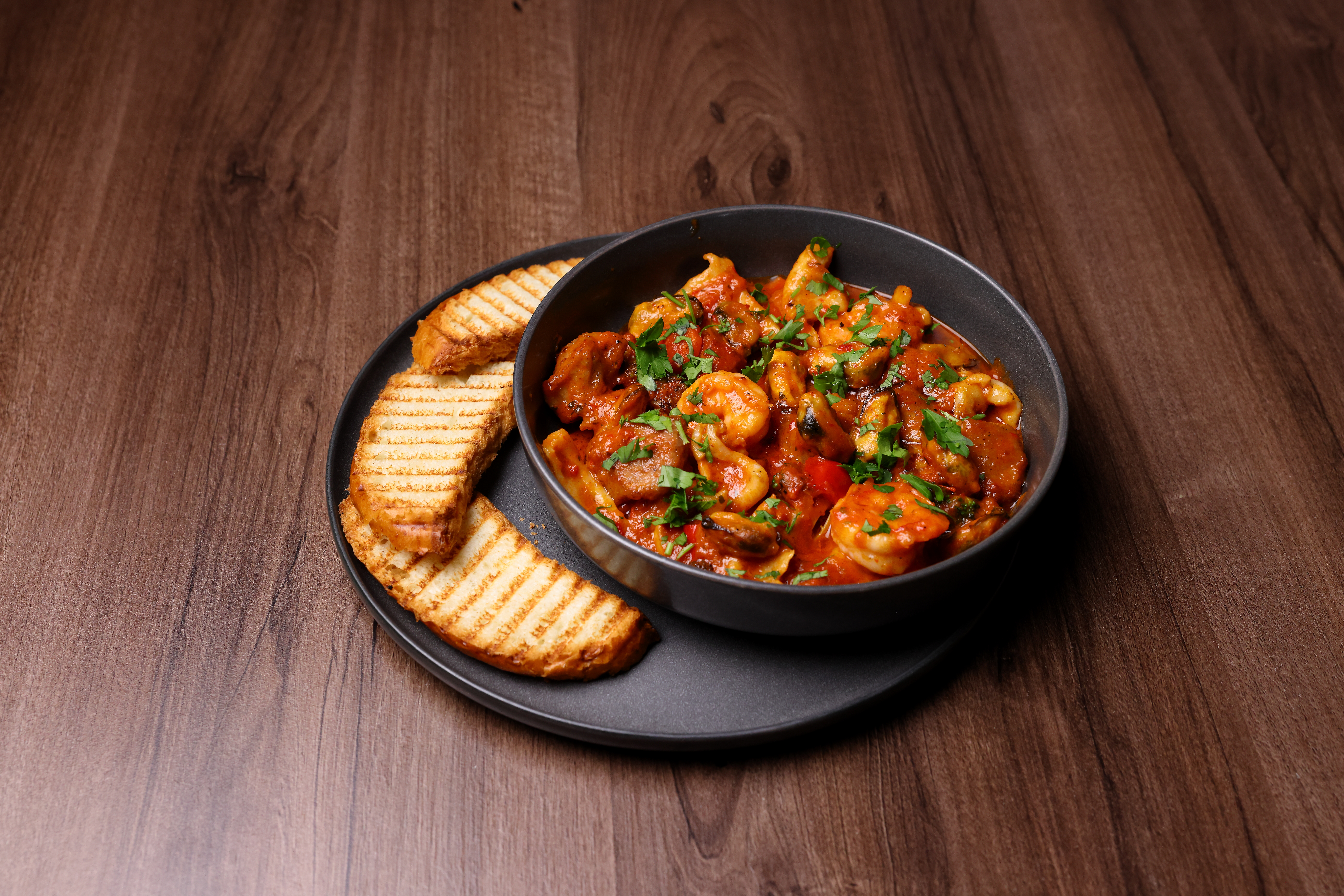Creveți, midii, calamar, carne de vitel, mix de legume, salsa de roșii, pătrunjel, pâine grillată.