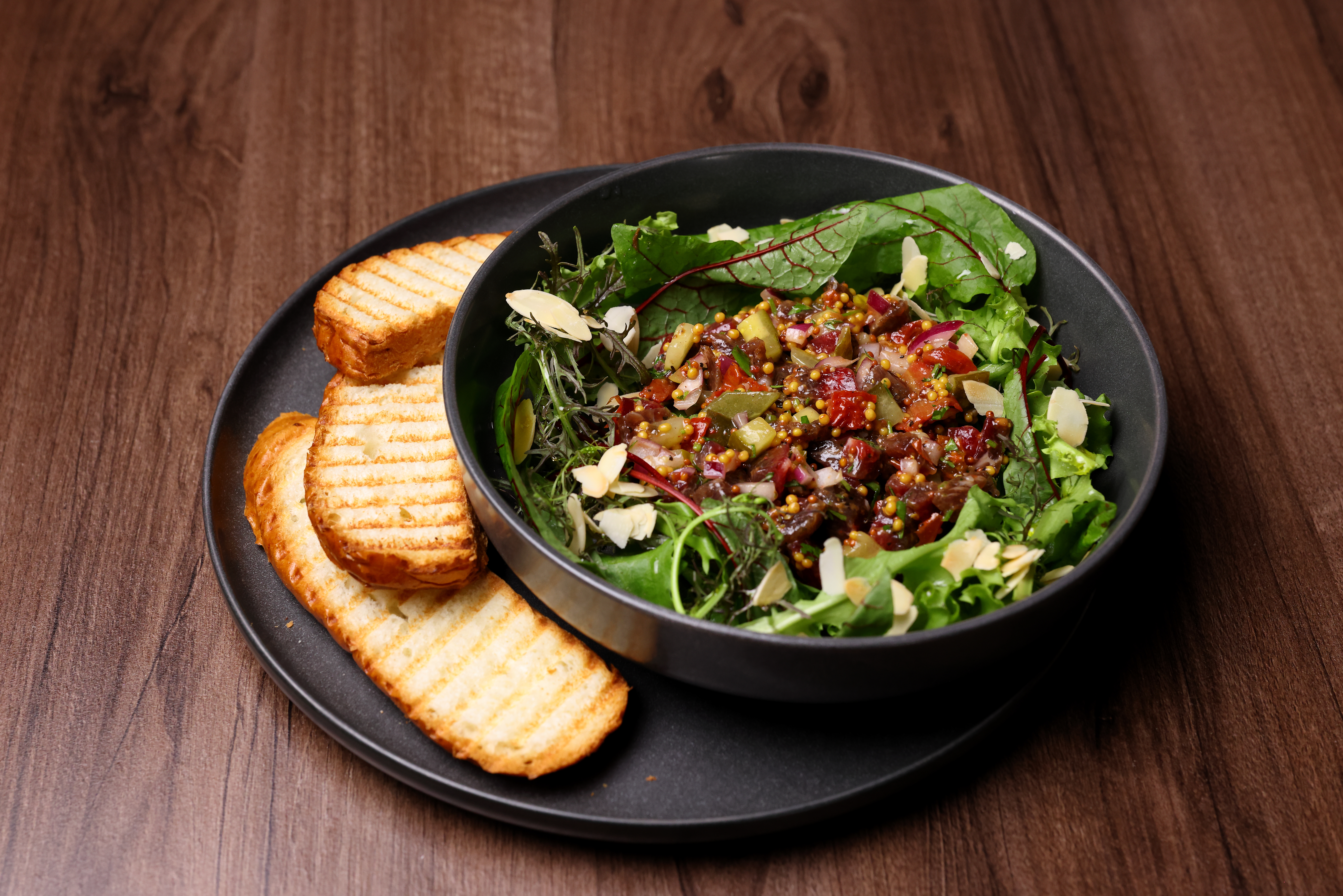 Beef gravlax, red onion, pickled cucumbers, sun-dried tomatoes, Dijon mustard, parsley, almond flakes, mixed salad, olive oil, grilled bread.
