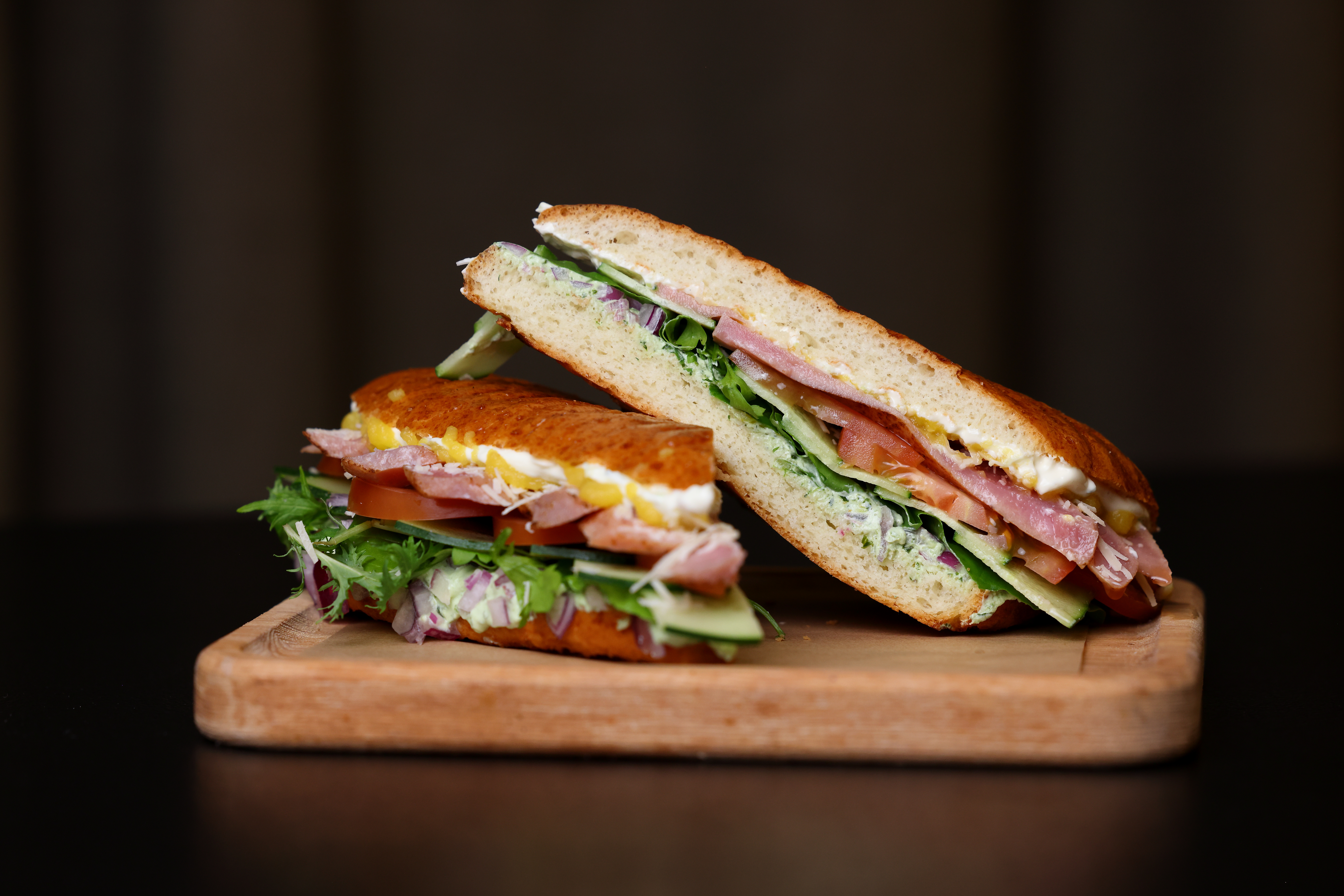 Brioșă, pârjoală de vită, sos tzatziki, cremă de iaurt și busuioc, salată mix, roșii, castraveți, cașcaval camembert, brisket, ceapă verde, sos tzatziki.